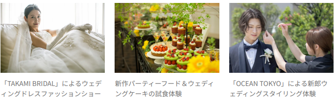 「TAKAMI BRIDAL」によるウェディングドレスファッションショーやホテルシェフとパティシエによる新作パーティーフード&ウェディングケーキの試食会、原宿発のモンスターサロン「OCEAN TOKYO」による新郎ウェディングスタイリング体験など、ロイヤルパインズウェディングの全てが詰まったスペシャルイベントとなっており、当日限定の特典も多数ご用意して、お二人のお越しをお待ちしております。