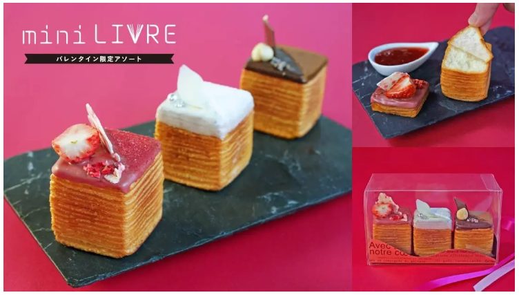「本(Livre)」をイメージした幾層もの層が美しいミニリーヴル。今年のバレンタインは、埼玉県産の希少な高級ブランド苺「あまりん」をはじめ、厳選したショコラとホワイトショコラを組み合わせた、心ときめく3種のフレーバーを1つのボックスに詰め合わせました。