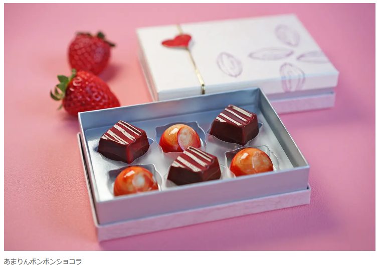 あまりんボンボンショコラは、埼玉生まれの希少いちご「あまりん」のおいしさと香りをぎゅっと濃縮し、ダークチョコレートとホワイトチョコレートに合わせました。
