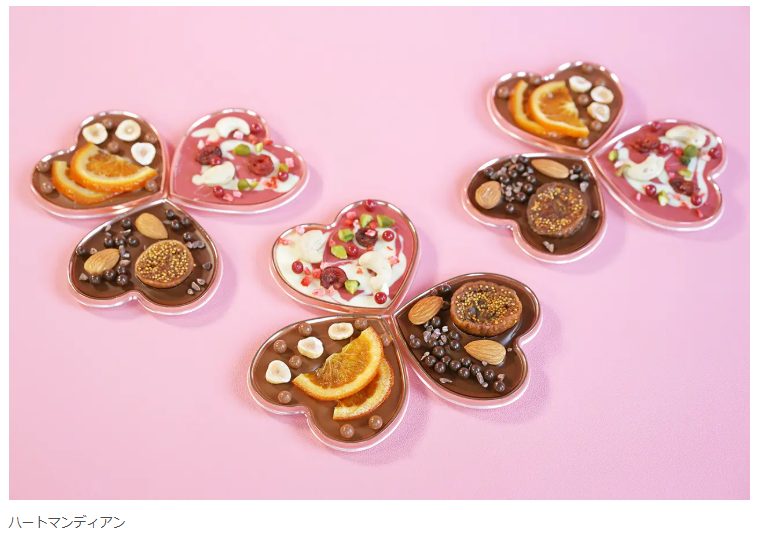 ハート型のチョコレートに、ナッツやドライフルーツを彩り豊かにトッピング。見た目も可愛くプレゼントに最適。