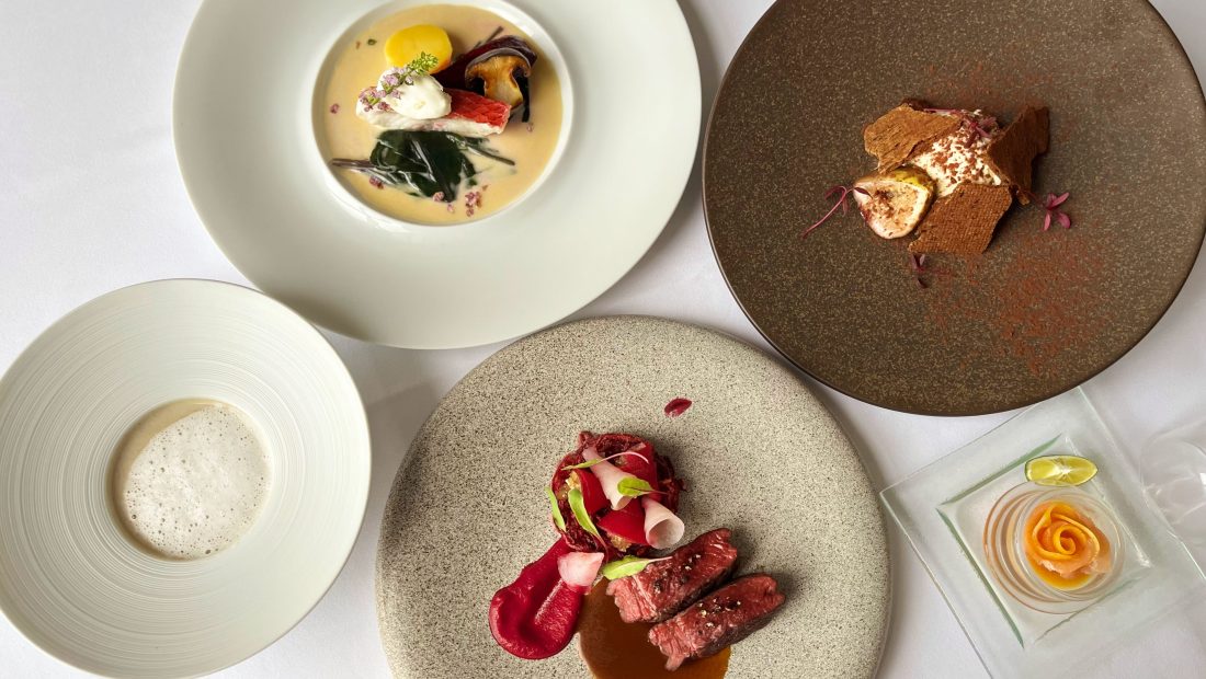 ◆紅葉鯛のタルタルと富有柿のピュレ 秋野菜のグレックを添えて