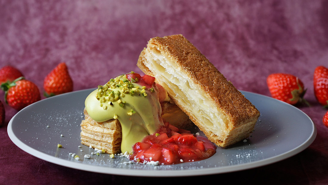 自家製パイ生地をプレスせずに焼き上げたミルフィーユはとても軽い食感に。