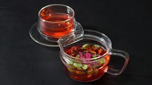 ハイビスカス、バラの花びらを浮かべたトップラウンジオリジナルフレーバーティー。ほのかに香る華やかな花の香りと酸味が特徴。