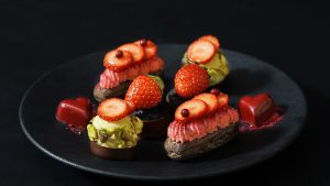 あまりんに模したティラミス。マスカルポーネとクリームチーズを合わせたムースの中にはあまりんのジュレ。真っ赤なグラサージュをかけて、種を白ごまで見立てています。