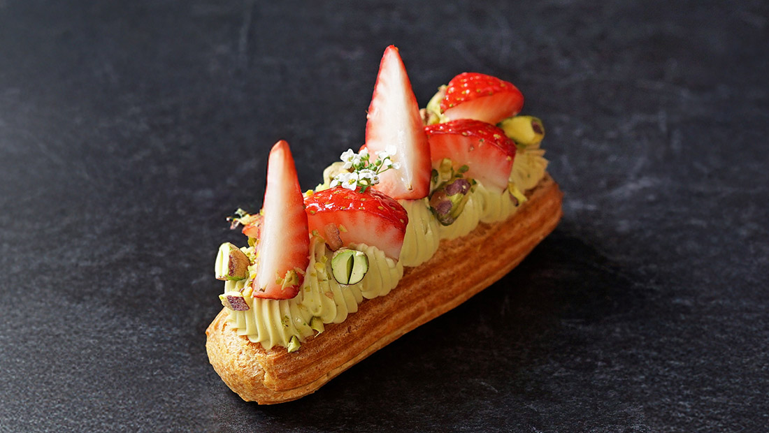 カスタードクリームとあまりんジュレを詰めたエクレアに、たっぷりのピスタチオクリームを絞り、「あまりん」と香ばしくローストしたピスタチオをトッピングしました。