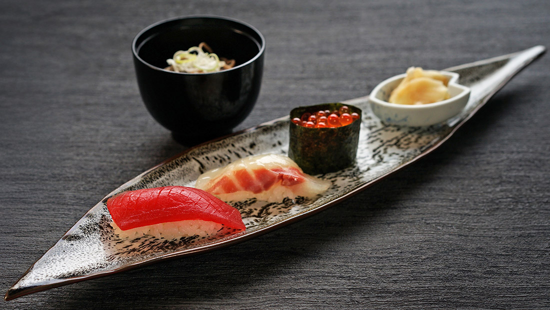 ◆海鮮握り三種 赤身 白身 軍艦 一口蕎麦