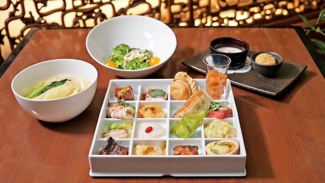 16マスのお料理に、五目炒飯 または 海老ワンタン麵、サラダ、スープ、デザート付き!