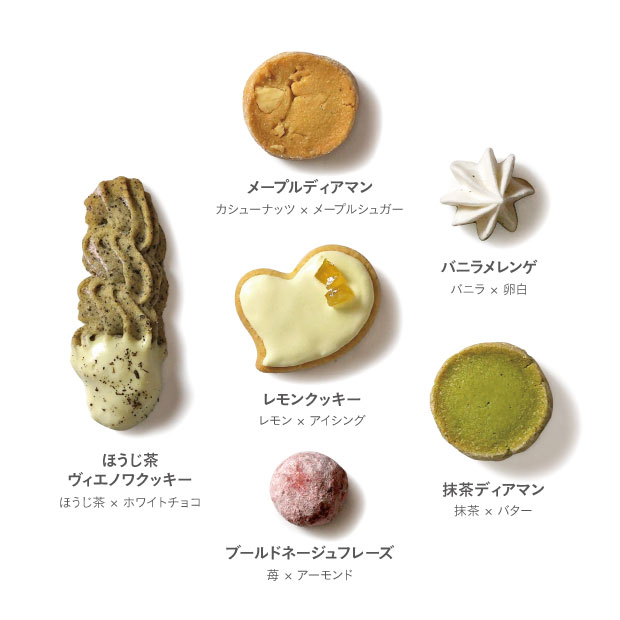 レモンクッキー・ほうじ茶ヴィエノワクッキー・メープルディアマン・抹茶ディアマン・ブールドネージュフレーズ・バニラメレンゲの6種をご賞味ください。
